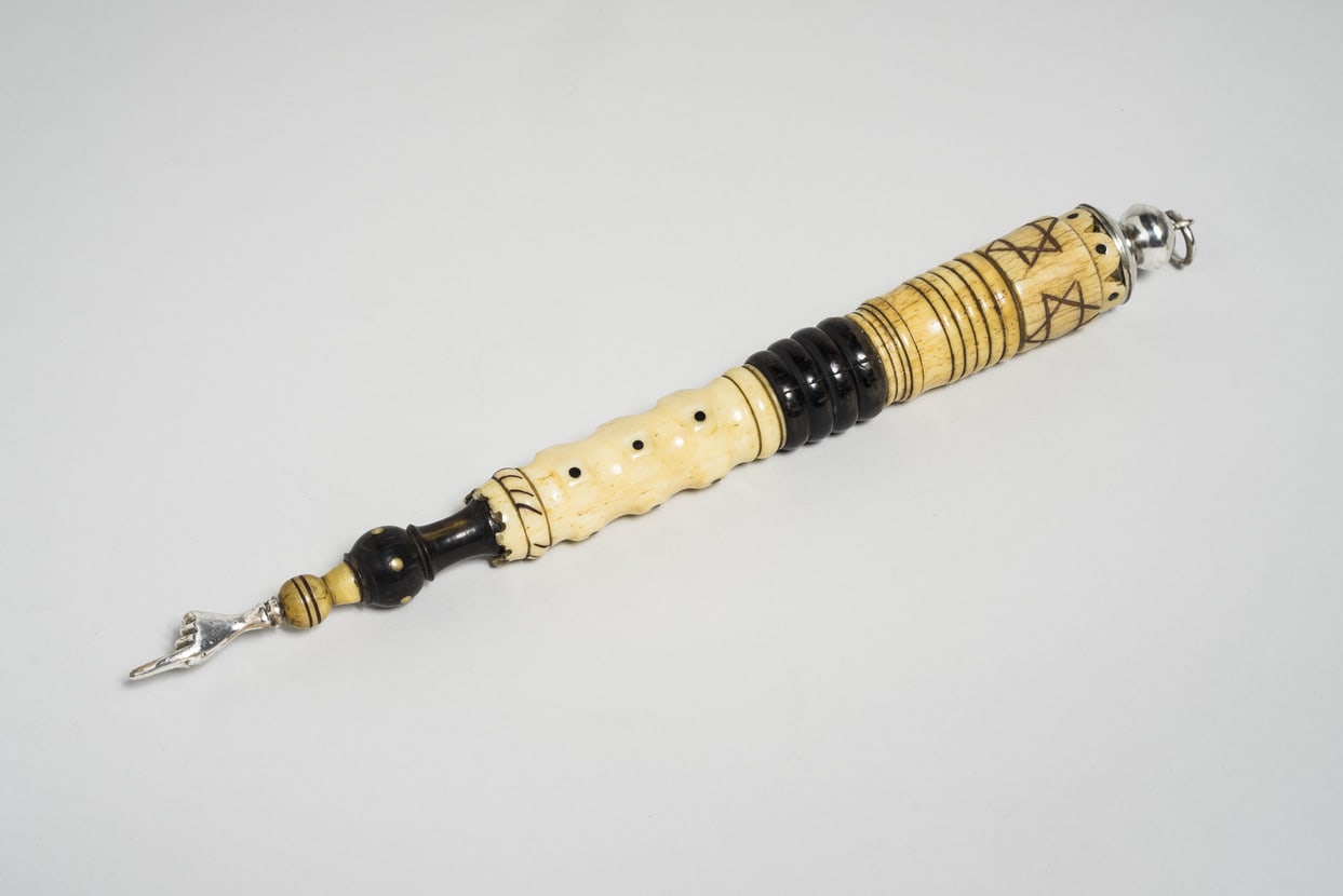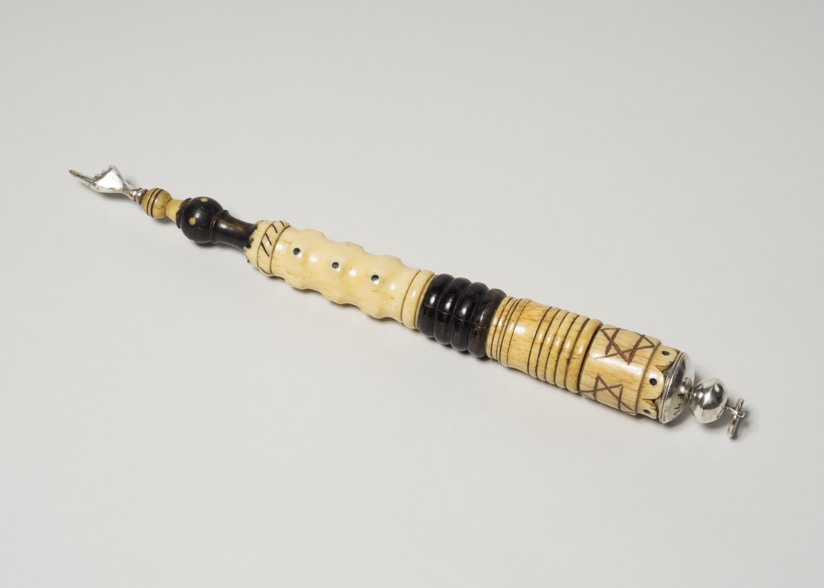 - Bone: carved and inlaid; horn; silver: cast