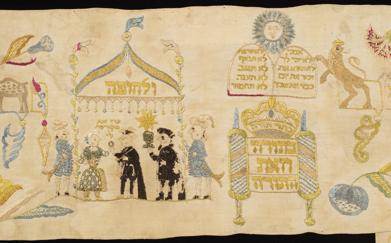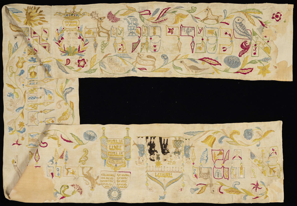 This beautifully embroidered Torah binder is filled with charming animals and birds, but is missing its first section, which would have listed the name of the boy on whose behalf it was dedicated. The date of his birth and the name of his father, Alexander Segal, however, are inscribed in Hebrew on the surviving sections. The baby was born on the day after the harvest holiday of Shavuot in the year [5]510 [=June 12, 1750], under the sign of Gemini. The zodiac symbol is also included.