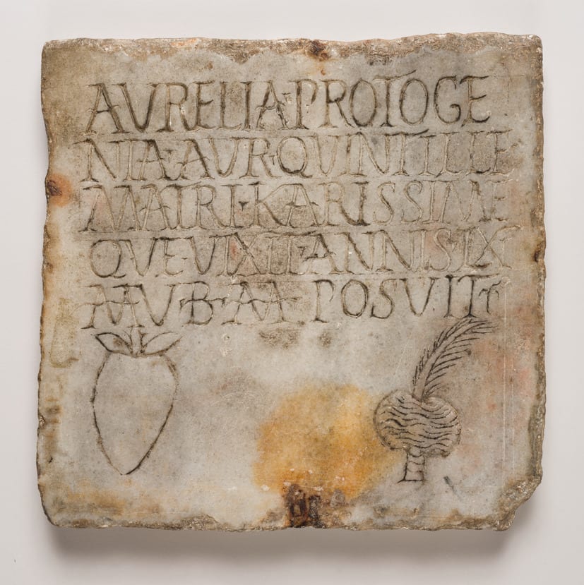 The Latin inscription reads: "Aurelia Progenia set up [this stone] to Aur[elia] Quintilla, her dearest mother, who lived sixty years, five m[onths], in grateful memory." A citron (etrog) and a palm branch bundle (lulav) are depicted.