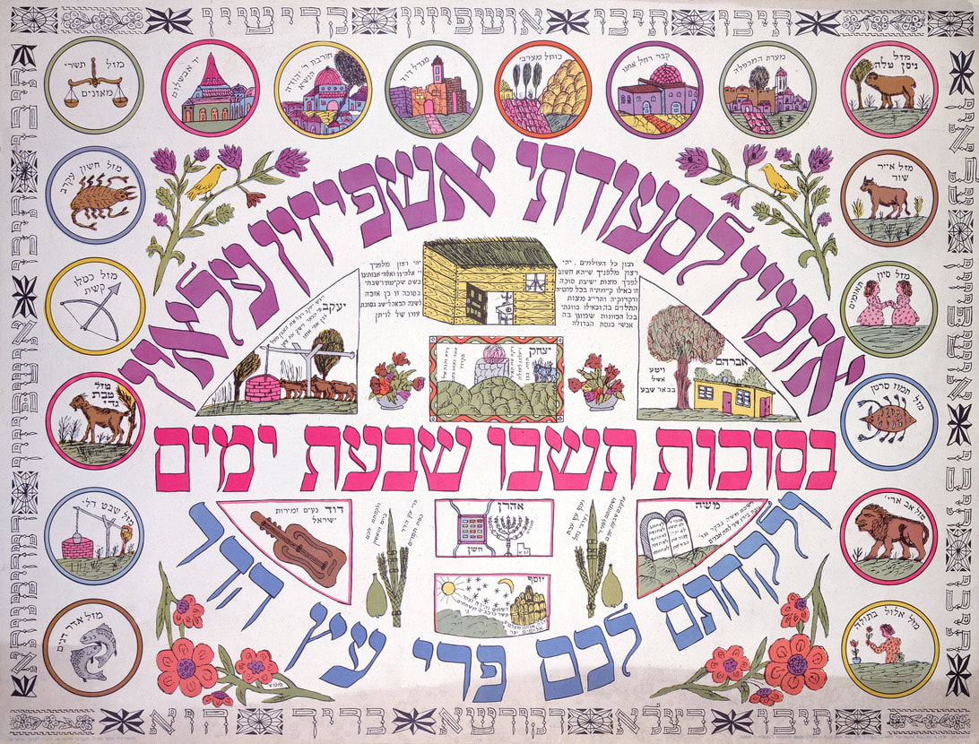 Four days after Yom Kippur (Day of Atonement), the autumn harvest holiday of Sukkot begins. Observant Jews build sukkot, or booths similar to those used by the Israelites in the desert after the Exodus from Egypt. During the holiday, it is customary to eat in the sukkah and to symbolically invite seven biblical figures or ushpizin--Abraham, Isaac, Jacob, Joseph, Moses, Aaron, and David--one on each day of the festival. The sukkah walls are often covered with decorations such as this 20th century printed example featuring illustrations and inscriptions related to each one of the biblical guests at center as well as depictions of Jewish holy sites and the signs of the zodiac within medallions above and along the sides.
