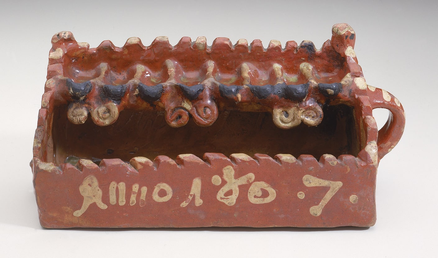 German ceramic Hanukkah lamps are rare, and only nine examples have been published. Most imitate the forms of German pewter lamps, with the row of lights across the middle of the backplate and a wide drip pan below. The method of decoration of the Jewish Museum lamp, consisting of a reddish-brown slip and cream paint that have been glazed, is characteristic of several regions of Germany, particularly Hesse and the Lower Rhineland, and it spread throughout Germany and beyond. It is impossible to identify the exact town where this lamp was made, even if the signature can be read as Münster, since there are a number of German sites with this name. It is unlikely to be the major city of Münster, since the production of lead-glazed ceramics in Germany was generally carried out in the countryside rather than cities, in order to be near fuel sources and to minimize pollution from the smoke and chlorine gas produced.