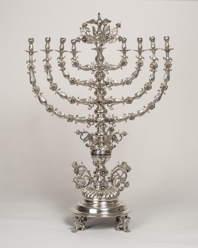 Copper alloy examples with inscription dates indicate that this type was popular in the second half of the eighteenth century. However, several silver versions were made in the latter half of the nineteenth century in Lvov, as represented in the collection by this magnificent example. It appears to be a copy of a nearly identical lamp that stood in the Przedmiejskiey Synagogue in Lvov until 1939, and which is said to have been made in Breslau in 1775. At least two other copies of this Lvov lamp were made around 1870.