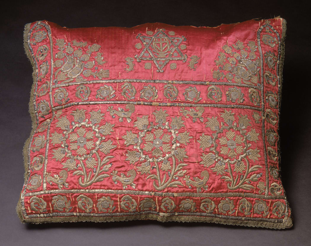 To the basic composition the embroiderer of the cover added two Jewish motifs, a Star of David enclosing a stylized menorah. Executed at the same time as the remainder of the cushion embroidery, the presence of these symbols indicates that the cover was intended, from the first, to serve a ritual function. Nineteenth-century travellers' accounts and historical records suggest two possible uses: for carrying an infant to the synagogue for circumcision or for the Passover seder, when it is customary to recline as a sign of ease and freedom. The relatively minor wear on the pillow suggests it was used for circumcisions, rather than on Passover.