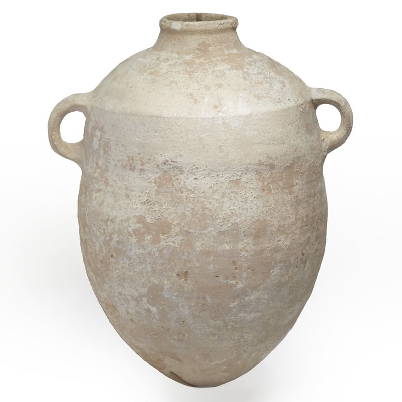 Storage jars with narrow mouths were probably used to hold wine and oil so as to minimize evaporation. Wider-mouthed jars contained grains, fruits, and vegetables. Both types were quite common in Iron Age homes and storerooms, but are rarely found in tombs. Because their bottoms are pointed, they probably were placed on pottery stands, partly buried or leaned against the wall.