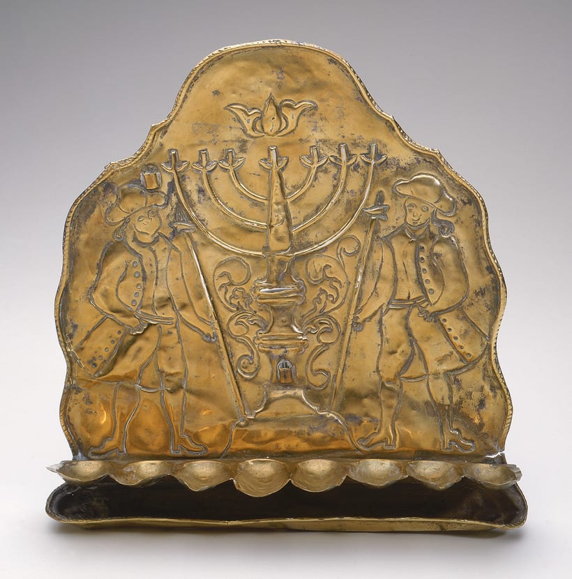 This lamp represents two figures holding long tapers for lighting the Temple menorah. They are clean shaven and wear tricorn hats, wigs, skirted coats, and breeches. This costume and grooming are typical of fashionable Dutch gentlemen of the eighteenth century. In many countries of Europe and the Middle East, Jews were required to wear distinctive colors, badges, hats, or other specific items of clothing. However, no such requirements existed in Holland, and the Sephardi community in particular delighted in wearing the latest styles. By contrast, Dutch Ashkenazi Jews were bearded and wore more traditional styles of clothing, such as the tall-crowned, wide-brimmed hat of Rembrandt's day.