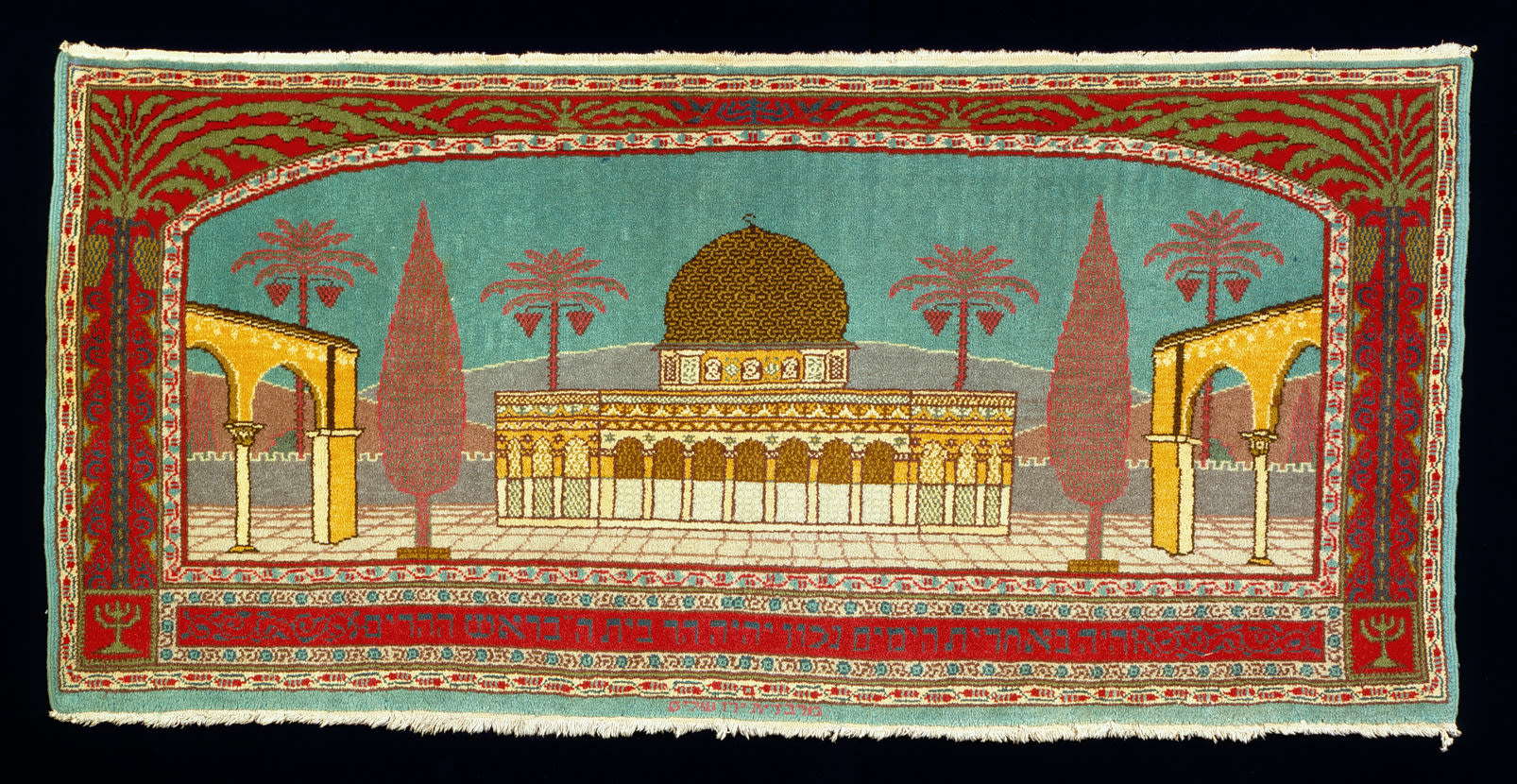 That this is a messianic view of the rebuilt Temple is indicated by the verse at bottom: But in the end of days,.... the mountain of the Lord's house shall be established (Micah 4:1). The imagined building is based on the Mosque of Omar on the Temple Mount, with imagined arcades on each side. Two large palm trees border the central image and a stylized menorah is in the border above the dome.