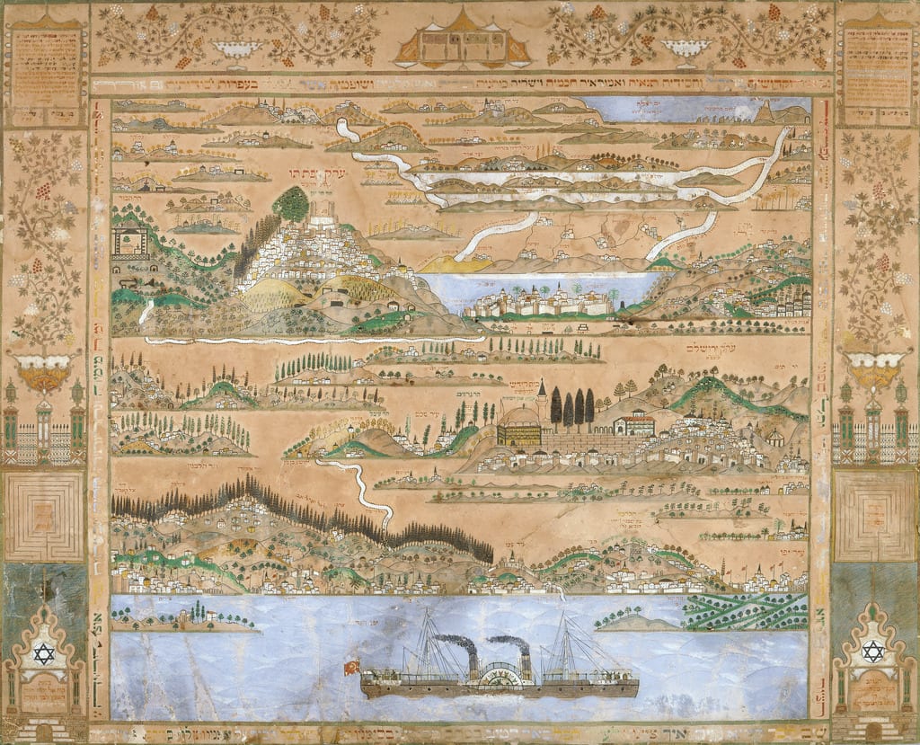 A shiviti is a plaque or paper inscribed with Psalms 16:8 "I am ever mindful of the Lord's presence." This example is highly unusual in that its purpose as set forth by the biblical quotation at top center is combined with a detailed topographic map of holy sites of the land of Israel. The map is oriented from west to east with the Mediterranean Sea in the foreground and the Dead Sea at top right. This is the viewpoint found in the earliest printed Hebrew map published in Amsterdam in 1620/1 and widely dispersed in the map of the very popular Amsterdam Haggadah of 1695. Major sites on this map are distinguished by the title "the holy city;" they are Jerusalem, Safed, Hebron and Tiberius (in descending order of size and importance). An amusing detail is the steamship flying a Turkish flag in the foreground, which is explained by the artist's inscription found in the bottom corners (at right) "The scribe…Moses Ganbash…written in Istanbul" (at left) "In the year 'Look to the Lord; be strong and of good courage; O look…'" (Ps. 2 7:14). This last sentence is a chronogram yielding the date 1838/9.