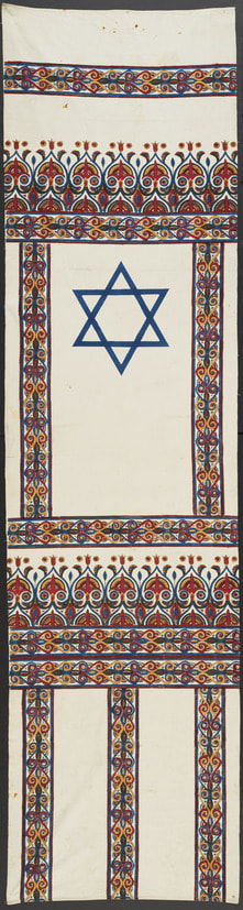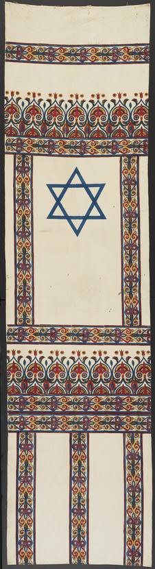 Salonica, in northern Greece, was home to a large Jewish population before World War II. This textile is one of four that may have been decorative hangings or banners in a Jewish public building or synagogue there. The design and color scheme imitate Macedonian embroidery. On November 2, 1918, Salonica’s Jews celebrated the first anniversary of the Balfour Declaration, in which Britain endorsed the establishment of a Jewish home in Palestine. The banners may have been used in the citywide festivities, given the combination of the Star of David, a Zionist emblem, and the Macedonian style, conflating local pride with desire for a Jewish homeland.