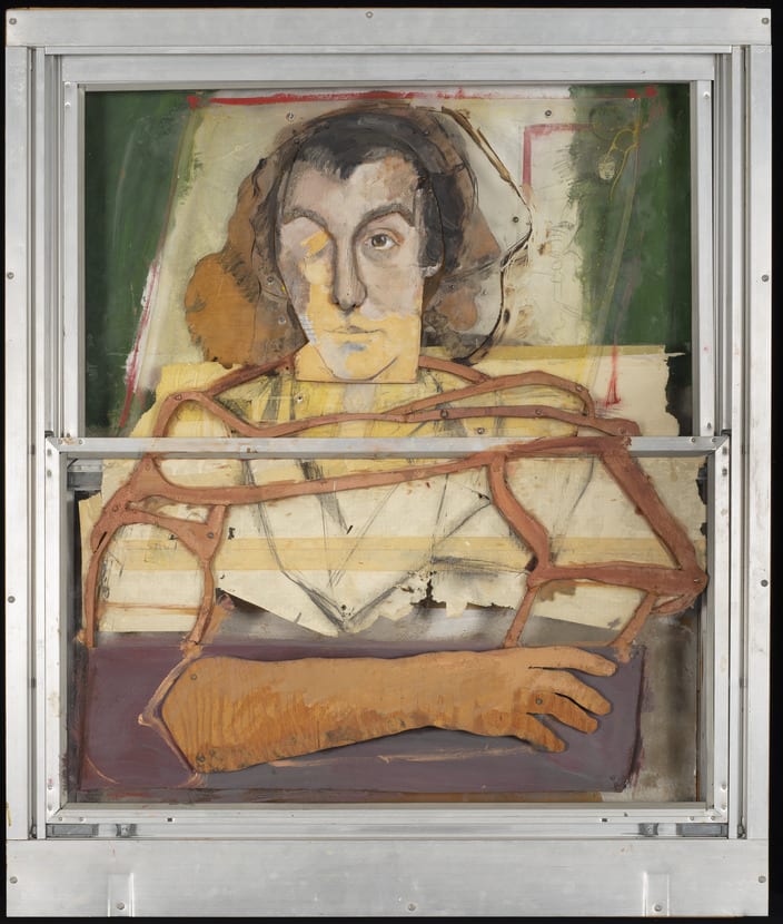 Vera G. List (1908-2002), a life trustee of the Jewish Museum, was an active collector and champion of contemporary art. In Rivers's Portrait of Vera List, the artist immortalized his patron without idealizing her. One of Rivers's early three-dimensional assemblages, this work is roughly fashioned and retains his characteristic gestural brushwork. Through the convention of portraiture, Rivers engaged in a dialogue with his artistic forefathers, while updating their traditional practices with new materials and techniques. In this half-length portrait, the collage elements, which include painted pieces of wood, Plexiglas, and torn sheets of graph paper, were applied on top of and behind the panes of a storm window to create a disjointed portrait of List. Rivers exploited the window's sliding panes, which can be moved to reveal different images. On the one hand, Rivers literalized the notion that a painting is like a window, offering a view into an imagined pictorial world; however, he did not adhere to the conventions of illusionistic painting. The work's composite views and fragmentation of the sitter's facial features and body parts prevent a coherent reading of the person depicted. This use of collage and fragmentation shows the artist's affinity with earlier avant-garde movements, such as Dada and Cubism, while the innovative use of materials and mixed media, as well as the conflation of high and low culture, coincides with the chief concerns of the contemporaneous Pop Art movement. This portrait conveys the deftly complex yet unfinished qualities of Rivers's distinctive style.