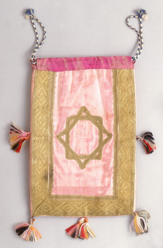 This modestly decorated bag bears a motif common in Islamic art: the intersecting squares that form an eight pointed star. On the reverse is a house, which may refer to the Moroccan Jewish name for tefillin bags, bayit, or house.