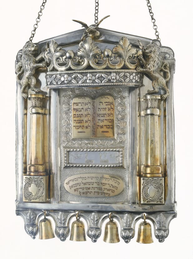The Hebrew inscription reads: "Donation to the Holy Congregation in Kleinbardo[r]f from... Joseph son of...Samuel Tuchman in Newark in the country of America in the month of Sivan [5]621" (=1861)
