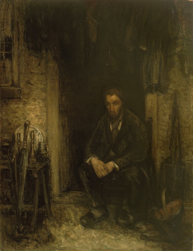 The Jewish Museum's "A Son of the Ancient Race" is one of the several reworkings depicting a secondhand clothes peddler in Amsterdam's Jewish quarter, based on an 1888 watercolor in the Rijksmuseum, Amsterdam which includes a young girl seated on the peddler's lap. For Israëls, children served as elements of hope within scenes of sorrow and poverty. Yet for the oil version the artist preferred to concentrate entirely on the figure of the weary man. Israëls has moved the now solitary figure close to the middle of the canvas according to the compositional conventions of the Hague School. "A Son of the Ancient Race" exemplifies Israëls's compassionate observations of contemplative generic types. Having already dealt with issues of sorrow, piety, old age, and the acceptance of fate in the lives of Dutch peasants, he now directed these themes toward a humble member of his own religion. Although the sitter is known as Jacob Städel, the anonymity typical of the artist's titles suggests that the peddler's condition can be applied not just to Jews or the Dutch, but to all people.