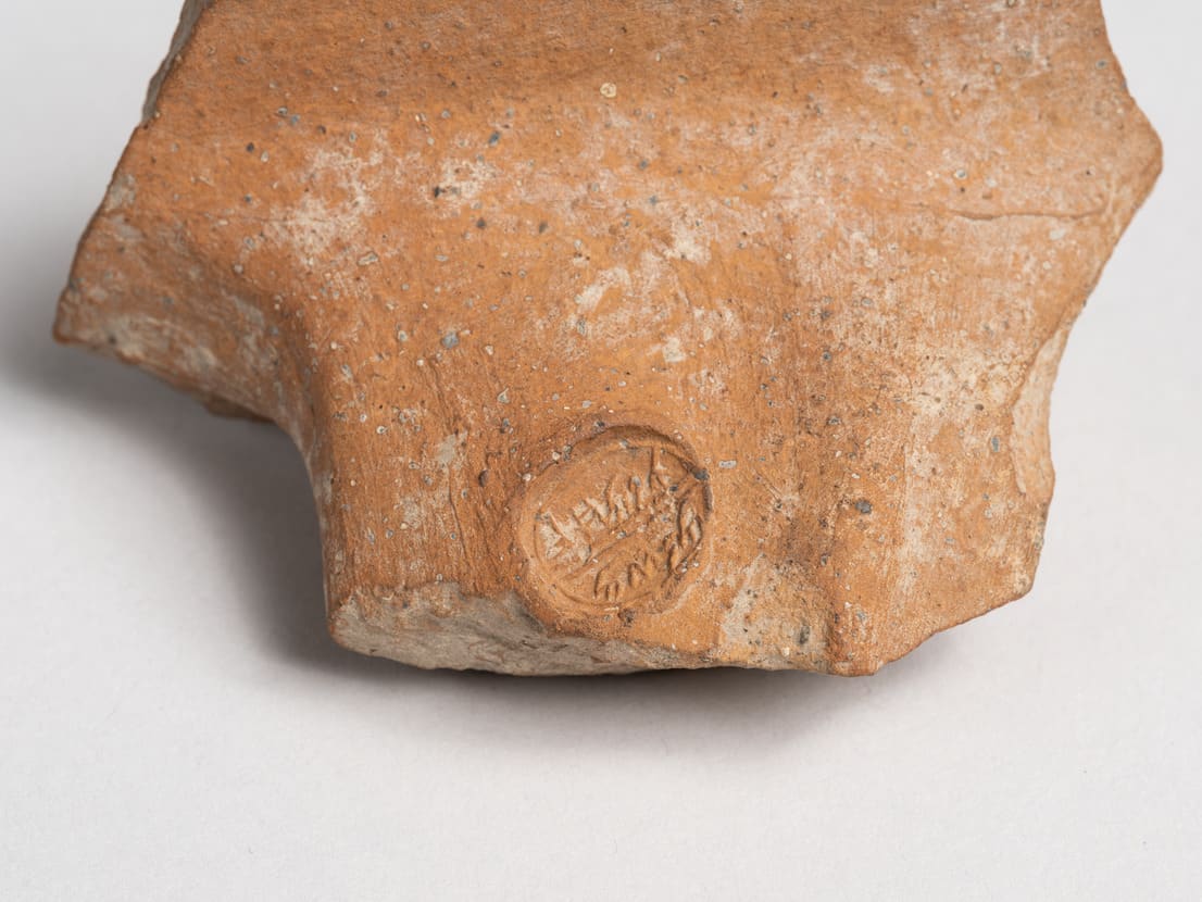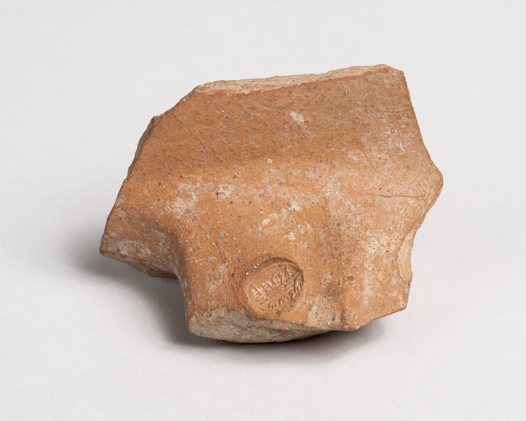 For the past century, archaeologists at Iron Age sites in Israel have been discovering the handles of large storage jars that were stamped with seals before firing. The jars originally had two types of seal impressions on their handles. The first, called royal seals, bear the inscription in ancient Hebrew: "[Belonging] to the king," placed above either a four-winged scarab or a two-winged sundisc. Below the figure is inscribed one of four possible place names: Hebron, Ziph, Socoh, or the unidentified Mmst. The second type of seal bears only an inscribed name and is thought to be that of a royal official. This example bears the name of Meshullam, son of Ahimelekh. The stamped storage jars, found in sites all over southern Israel and associated with the king and his officials, would seem to pertain in some way to governmental economic administration. They were most likely used to hold wine, oil or grain, possibly related to preparations by King Hezekiah against Assyrian attack in the late 8th century B.C.E.
