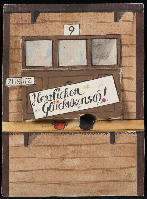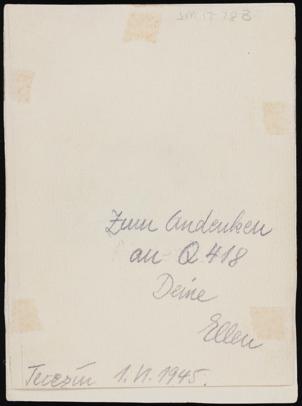Ellen Wertheimer and her friend Klara Levi were both survivors of Theresienstadt. This card was given by Ellen to Klara shortly after the camp was liberated in May 1945. The image is of camp barrack 9, where Klara lived. The German inscription reads, with a hint of wry humor: “And warm congratulations!”