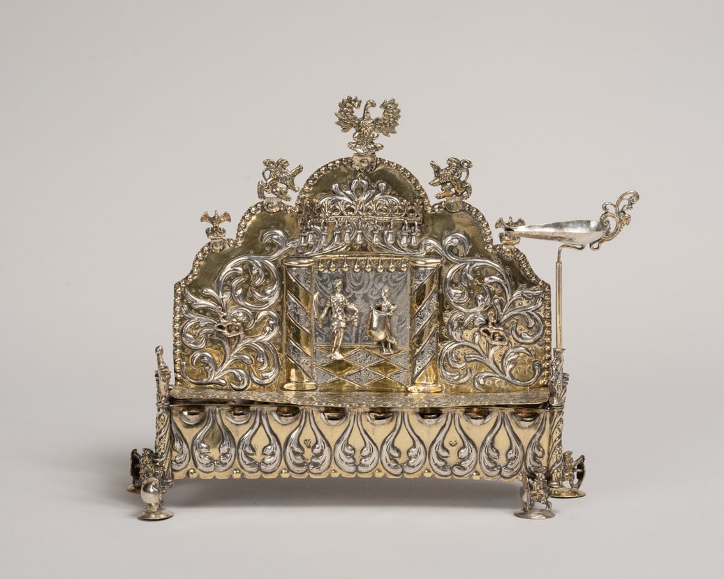 Having possibly adapted the form of a secular object to that of a Hanukkah lamp, with its requirement of eight lights, the silversmith Schüler added Jewish iconography as a central decorative motif on the backplate. The person represented is the biblical heroine Judith, whose courage, brains, and beauty enabled her to kill the enemy general Holofernes, who was besieging ancient Israel. The scene on the lamp depicts the moment when Judith, seeing Holofernes passed out from too much drink, cuts off his head. She will then place it in a sack that her maid holds open so they can secretly carry it out of Holofernes's camp.
