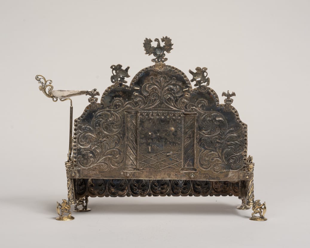 This lamp is among the earliest silver backplate lamps that also have legs for placement on a table or windowsill. It can be dated within Schüler's period of production by the rounded, symmetrical style of the scroll decoration, which is typical of the early Baroque period of the late seventeenth century. Like the chest-shaped lamp, there is a resemblance between the form of this lamp and that of silver inkstands in Germany during the same period. These consisted of a closed box with feet, which usually contained the well for ink and a container of sand for blotting, and a backplate.
