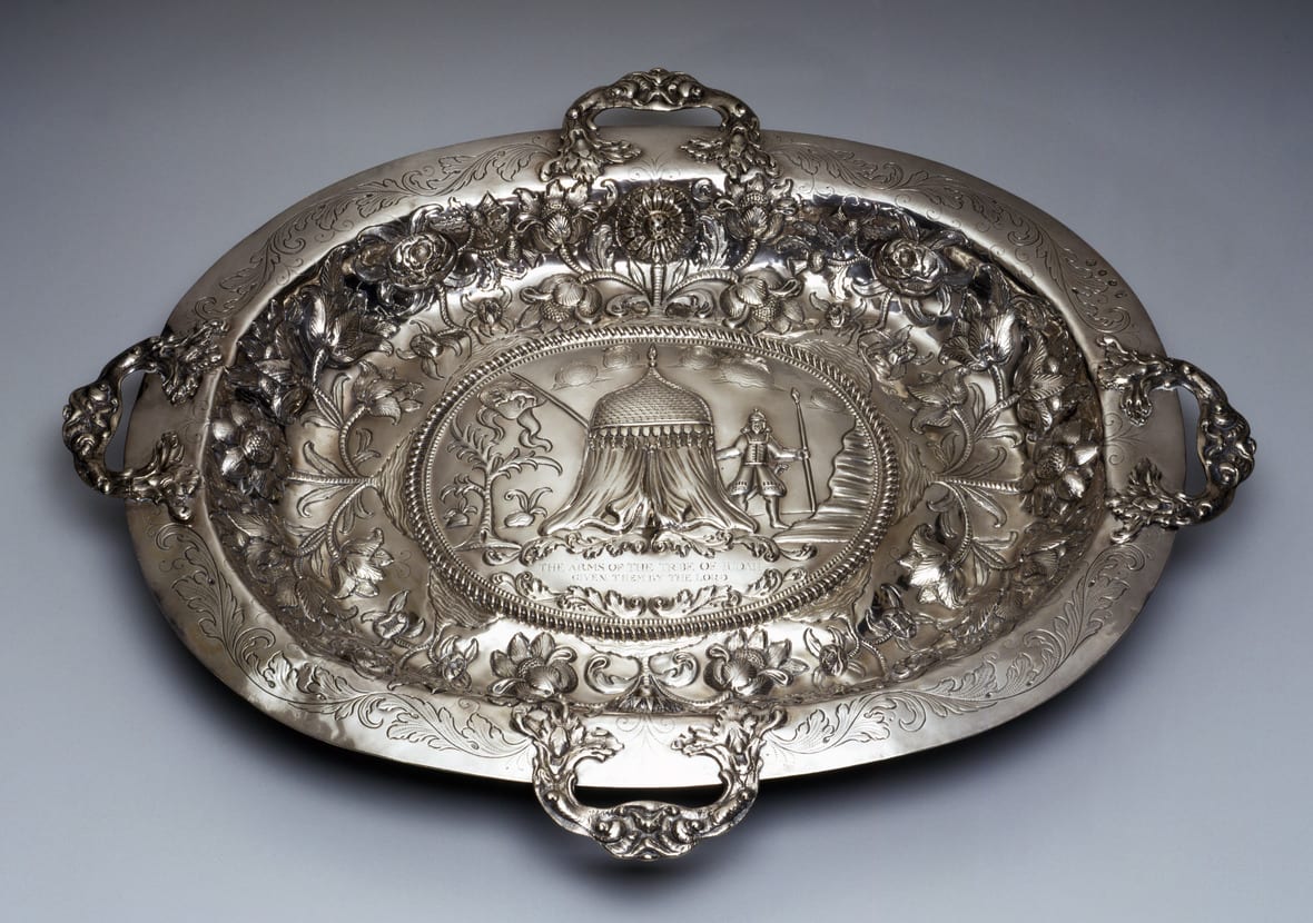 This four-handled tray represents the congregants' 100 - year annual tradition of offering presentation silver to London's lord mayor. Beginning in 1679, silver trays were commissioned for the mayor and sent to him, lavishly filled with sweetmeats. Most of these gifts bear as a central motif the seal of the Bevis Marks Congregation--a Tent of Assembly in the wilderness, a guard at its entrance, the whole surmounted by a cloud of glory. Similar presentation pieces were also offered to the lord mayor by other minority groups, namely, the Dutch Reform and French Protestant churches.