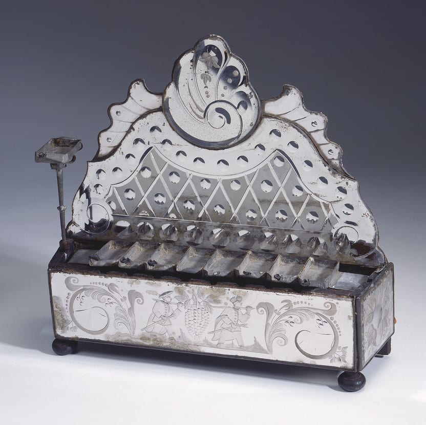 The use of mirrors on Hanukkah lamps served to intensify greatly the brilliance of the lights, and parallels the use of mirrored backplates on secular wall sconces. The engraved decoration found on the Jewish Museum lamp seems to have been a specialty of Italian mirror makers, as many examples were produced there in the eighteenth century. Italian glassmakers worked throughout Europe, bringing their skills and techniques with them, and so this piece could certainly have been made in Germany, which was one of the major mirror-producing countries.