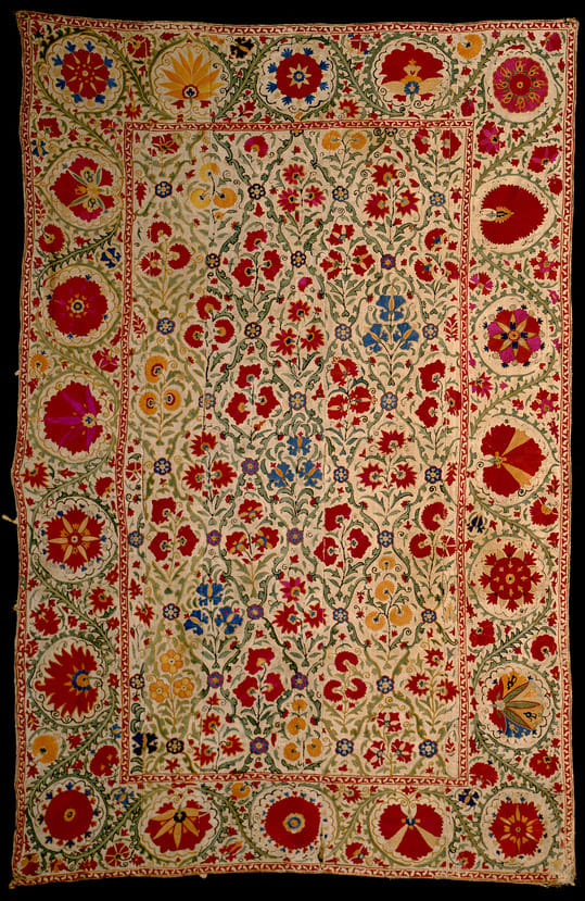 - Cotton: embroidered with silk thread; printed cotton lining; ikat silk binding