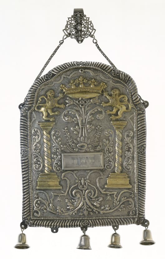 The composition of this shield lacks cohesiveness; the elements appear to float without clear relation to one another. Even the floral ornamentation consists of discrete forms without organic unity. Schedel also created a ceremonial goblet for the Burial Society of a Hessen community, a Hanukkah lamp in The Jewish Museum and an etrog container in the Frankfurt Historical Museum.