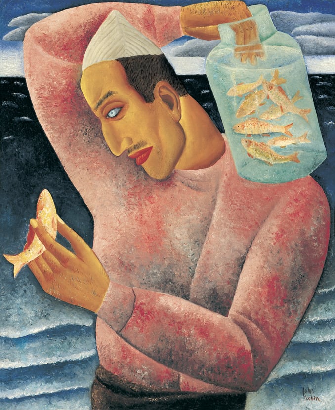 Reuven Rubin was one of the most important of these young pioneers, and his new land was a constant source of inspiration for him. The lyricism of his Goldfish Vendor (also known as Arab Fisherman) is typical of Rubin's colorful and self-consciously naive vision of the Land of Israel. The painting also exemplifies a theme recurrent in Israeli art of that decade-the portrayal of the Arab. The appeal of the physical vitality of these people becomes almost stereotypical in the literature and art of the 1920s. According to Nahum Gutman, Rubin's colleague, the Arab who maintained a continuing tie with the land constitutes the antithesis of the Diaspora Jew. His sense of belonging and his instinctual assets are exaggerated, even monumentalized.