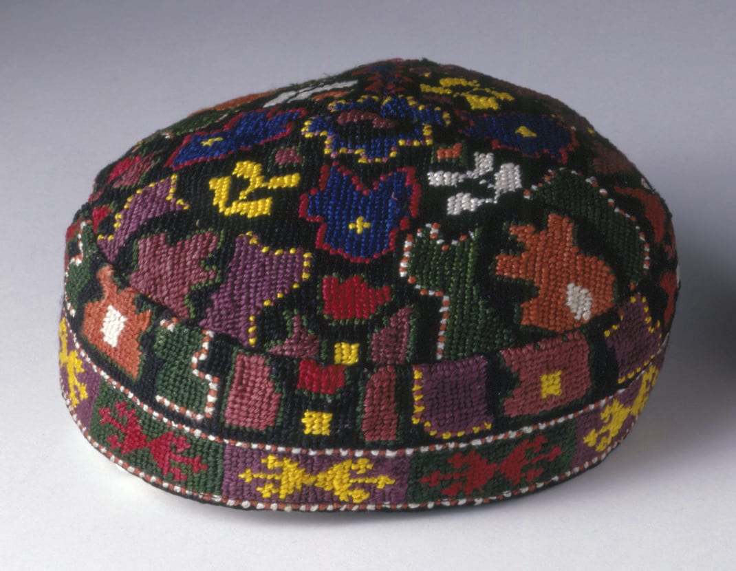 The cap of silk or cotton threads embroidered in floral shapes was a popular type of Jewish men's head covering in Bukhara. The cap was finished with a horizontal band of a different pattern.