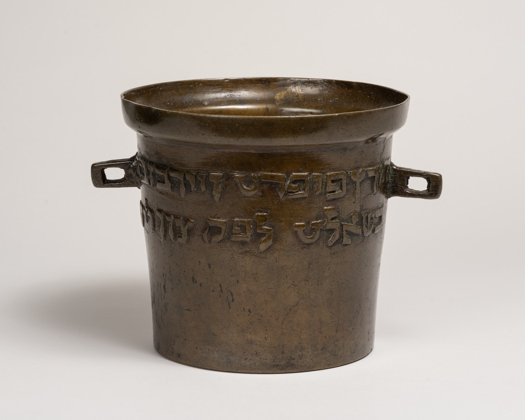 Medieval and Renaissance brass objects often bear inscriptions, initials, or coats of arms as signs of ownership, but very few extant examples bear Hebrew inscriptions. An interesting feature is the manner in which the year of manufacture is recorded on the pot. Since all the letters of the Hebrew alphabet have numerical value, the writer of a Hebrew inscription can either utilize biblical passages, make up his own text, or create plays on words, while indicating a date. On the pot, the letters for the Jewish year 5340 (=1579/80) might be read as the German word Schale, meaning pot or vessel, or as a corruption of cholent, a stew that is made on Friday before the Sabbath and is cooked overnight.