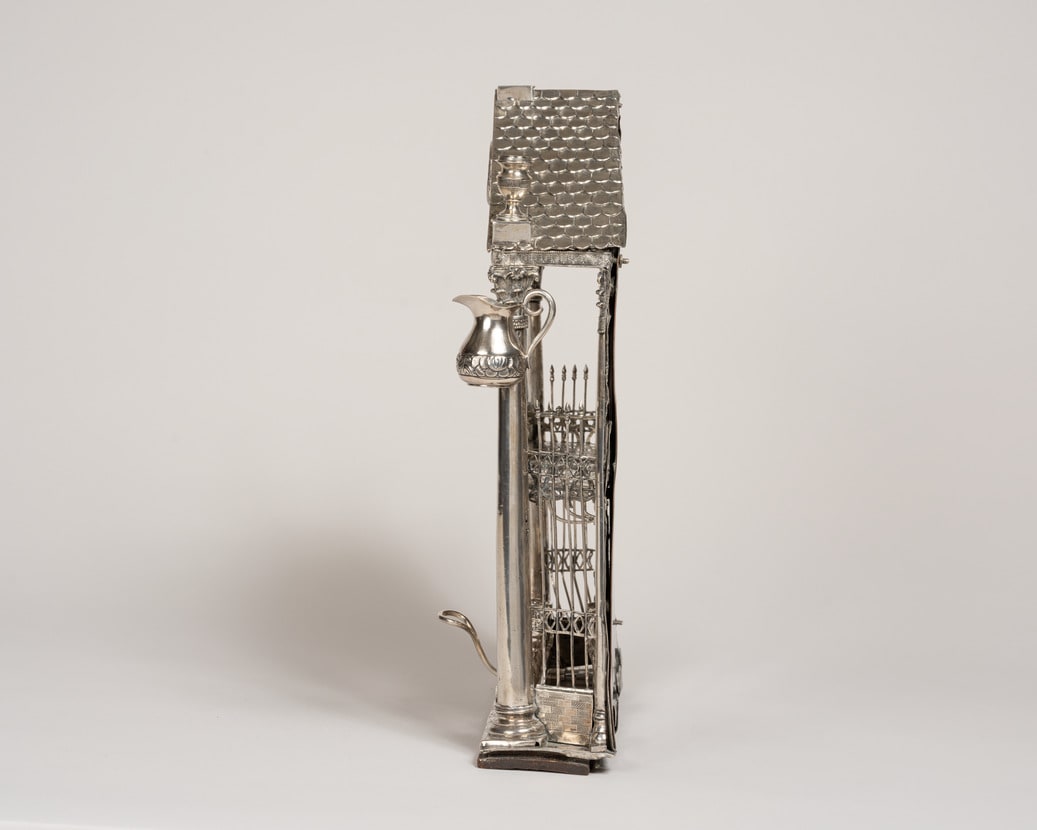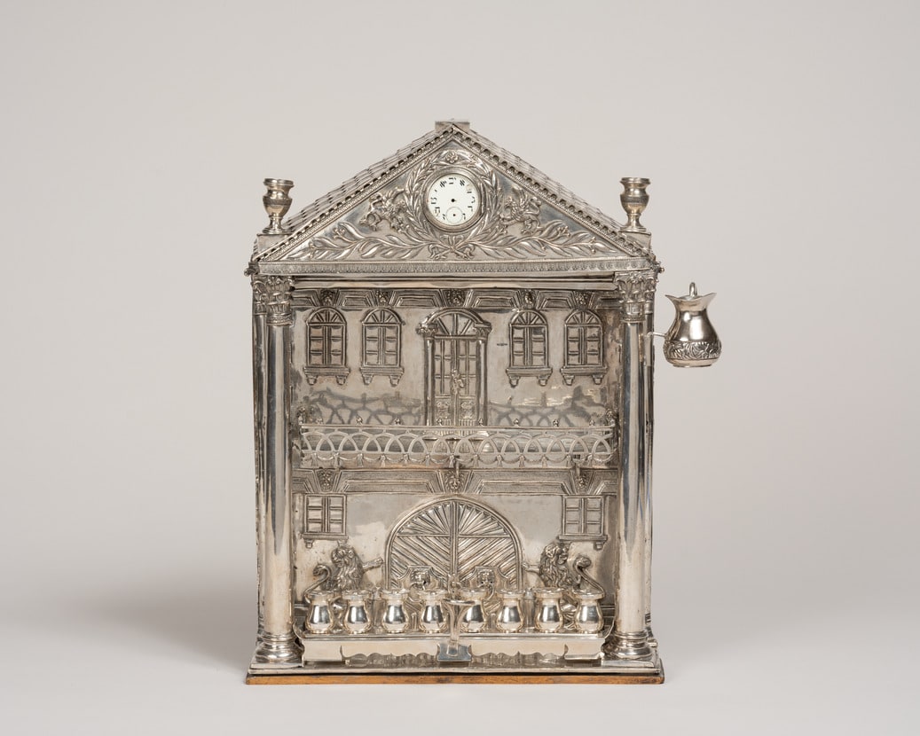 By far the most fascinating feature on the lamp is the clock placed in the pediment, all the more distinctive because the numbers are rendered in Hebrew, which uses letters of the alphabet instead of numerals. The addition of the timepiece gives the building the appearance of a town hall, whose clock would strike the hours for all citizens to hear. Clocks are included on several other architectural-form Hanukkah lamps as well, most of which appear to come from eastern Europe. For example, a lamp said to have belonged to the rabbi of Trisk in the Ukraine was, by the time of its publication in 1928, in the possession of a Jew from Warsaw. Hanukkah lamps with timepieces may have been inspired by the elaborate table clocks that became popular in the early nineteenth century. The owner could light the lamp on Hanukkah, and display it the rest of the year as a clock.