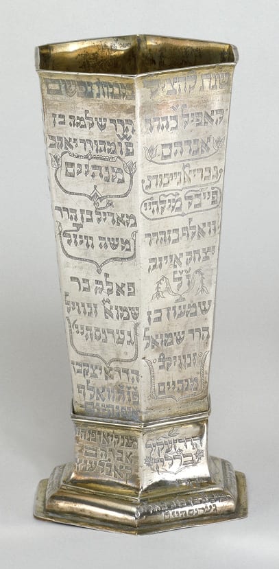 This beaker is the earlier of two commissioned by the Burial Society of Worms in the 18th century. A dedicatory inscription and date is engraved around the rim, and the rest of the beaker is inscribed with the names of the society's members, including honorary former members living in other towns. Among the names is that of Samson Wertheimer, who was Administrator of Finance for the Austrian Empire from 1694-1709 and David Oppenheim, the renowned scholar (1664-1736).