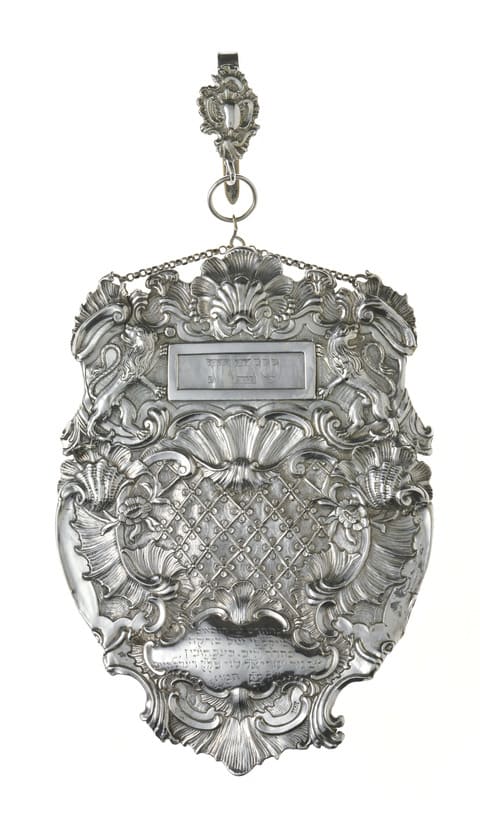 In its irregular outline, broken contours, and emphasis on shell and scroll ornament, this shield exemplifies the Rococo period. The center of the shield is filled with a diaper pattern framed by scrolls, shells, and flowers. The recessed box with plaques for readings is at the top held between the outstretched paws of two rampant lions. At the bottom is a cartouche inscribed: This was restored b[y] the gabbaim Leib Beckhoven and Azriel Levy from the charity boxes of the h[oly] c[ongregation] of Roedelheim, Thursday, 28 Tammuz [5]521 [1761]...