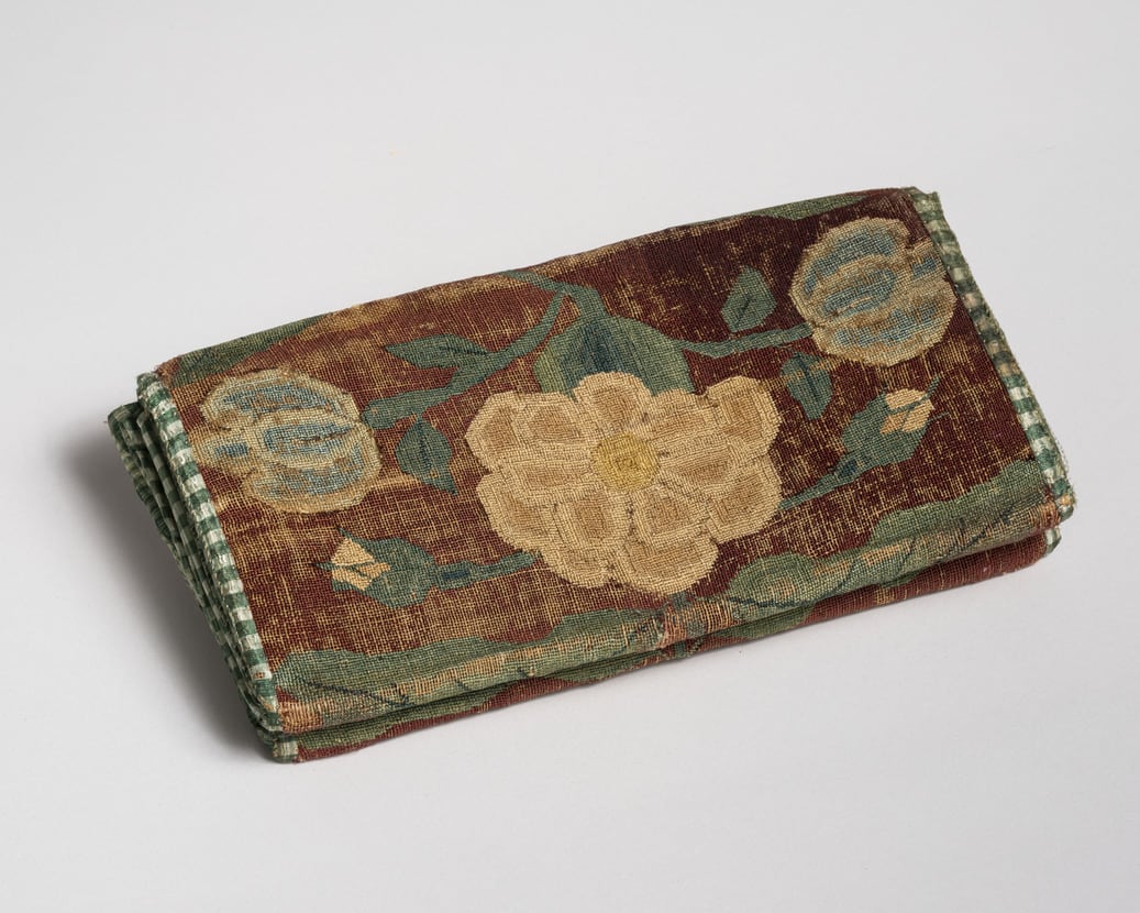 In eighteenth-century America, it was fashionable for both women and men to carry their valuables in purses in the shape of an envelope. Men's purses usually had two inner compartments on each side (as in this example), where they could store their correspondence or important documents as well as snuff or toothpicks, while those used by women usually had a foldover flap and only one compartment, where mirrors, combs, smelling salts, and other trifles were kept. Frequently worked on canvas, these purses were often embroidered with vivid colors and lined with colorful materials, contrasting with the solid colors used in clothing.