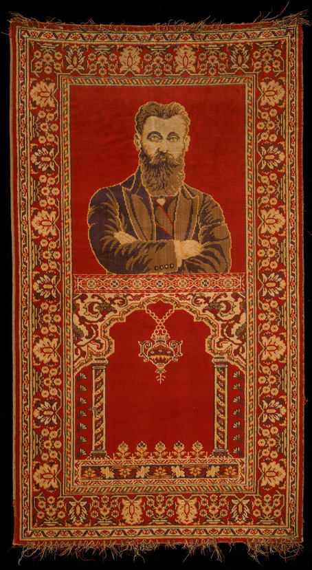 The composition of this rug is based on a photograph of Theodore Herzl taken in 1901. The center field is divided into two zones. The upper is filled with a frontal bust portrait of Herzl. Below is a hanging mosque lamp in a niche, the subject favored for prayer rugs. The flowers between the bases of the columns are a sign of paradise. Although derived from classic prayer rugs, the forms and composition of the lower half here are debased.