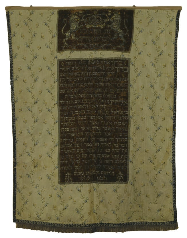 This Torah ark curtain is embroidered with the blessings recited after circumcision.