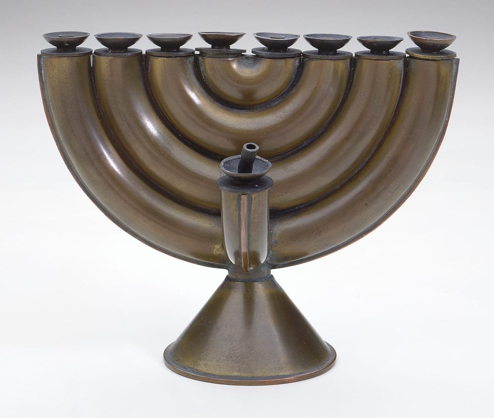 Wolpert brought the same vitality to his designs for Hanukkah lamps -- a substantial collection of which is in The Jewish Museum. Particularly notable examples include a lamp from the early to mid-1950s, JM 41-60, which features bold arc-shaped segments that create a menorah form. Wolpert's sleek and simple design, and the inexpensive material from which the lamp is fashioned, copper alloy, reaffirmed his belief that good design should be relevant to people of today and should be readily affordable to every person. While the design of the lamp is bold and modern, the rich patination of the metal and the use of oil are references to the traditions of the past.