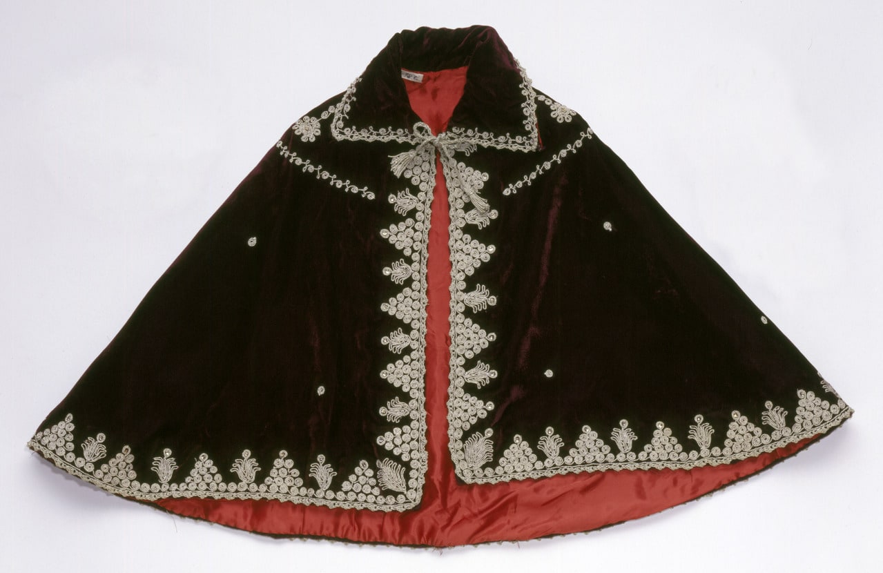 This cape appears to be a set with a skullcap and tefillin bag. From their size they appear to have been made for a bar-mitzvah boy. The deep red color with silk embroidery, as well as the placement and motifs of the decoration, suggest that the ensemble was made for a young man whose family came from North Africa or the Ottoman Empire.