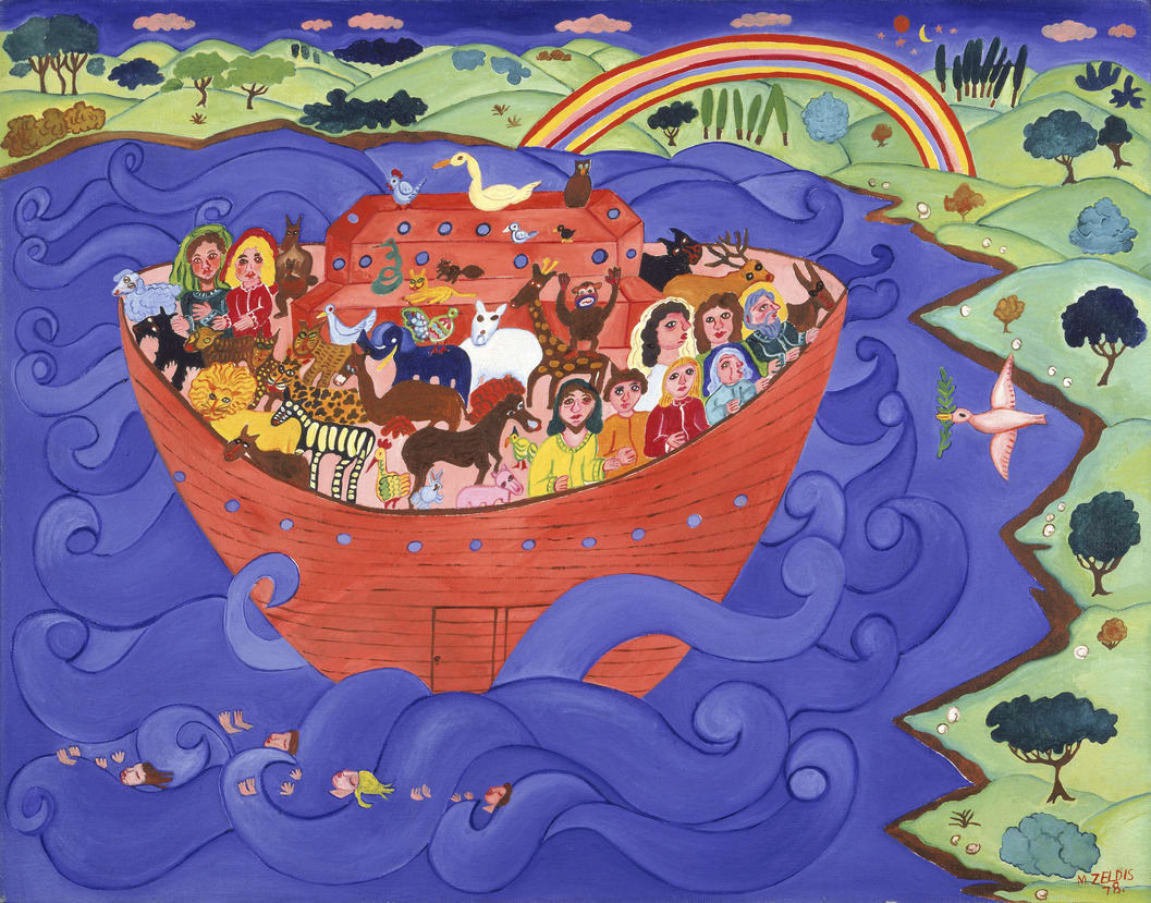 While living on a kibbutz in the 1950s, Malcah Zeldis received her first encouragement to paint from an Israeli artist who praised her work. Not until she returned to New York and studied at Brooklyn College twenty years later - offering her paintings as "life experience" - did her confidence as a self-taught artist emerge and her career start to soar. In her largely autobiographical narratives, Zeldis explores the richness of Jewish culture, personal memories, and contemporary society. The works are distinguished by their brilliant colors, sensuous forms, and richly detailed decorative patterns. Playfully, the artist often inserts her likeness into her paintings, and may appear here on board Noah's Ark.