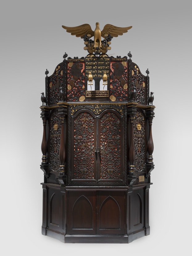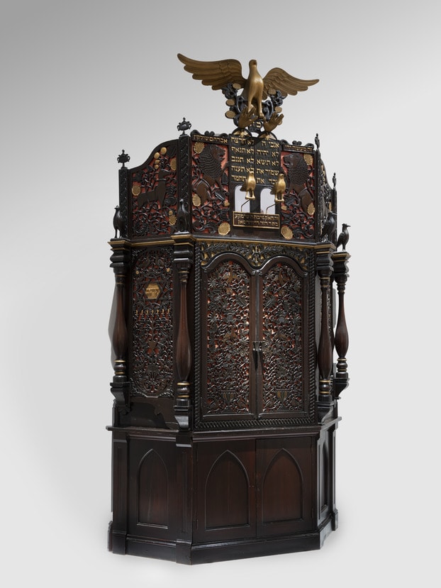 In Eastern Europe, Torah arks were often made out of wood and decorated with elaborate carvings incorporating mythical and symbolic creatures as well as vegetal motifs. Stylistically, this Torah ark, made in Sioux City, Iowa, by Russian Jewish immigrant and amateur woodcarver Abraham Shulkin, shows a close connection to Eastern European wooden Torah arks. The iconography of the eagle and the traditional images of the Tablets of the Law and the hands opened in the priestly gesture were often featured in Eastern European arks from the eighteenth and nineteenth centuries, all of which were destroyed during World War II. The synagogue of Izabielin, in Lithuania, not far from Shulkin's native village of Kapulie in Byelorussia, had a wooden Torah ark featuring beautiful carvings of animals and vegetation, including sunflowers similar to those in Shulkin's ark. In the synagogue of Olkienniki, also in Lithuania, the elaborate wooden Torah ark featured a pair of blessing hands topped by a double-headed eagle.