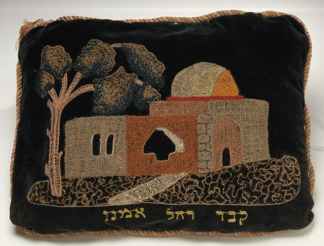 This cushion cover, one of a set of two, bears the standard image of Rachel's Tomb--a squat domed building with a tall tree nearby. This depiction is noteworthy for its bright colors, such as the yellow and white dome. It is labeled below The Tomb of our Mother Rachel. The matching pillow (JM 59-73 b) features a depiction of the first building of the Hebrew University, established in 1925. The parallelism between a traditional holy site and the first university in the Land of Israel reflects the content of the dedicatory ceremonies held in 1925.