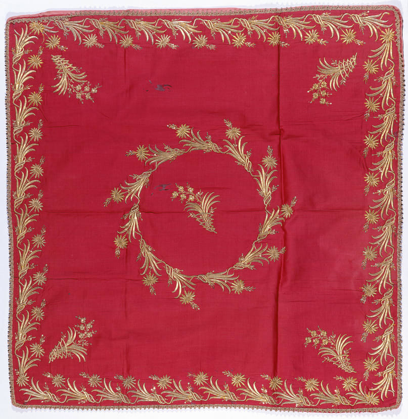 The composition of the cloth, a large central motif, diagonally placed corner motifs and repeated motifs around the edges, is typical of Ottoman embroidery.
