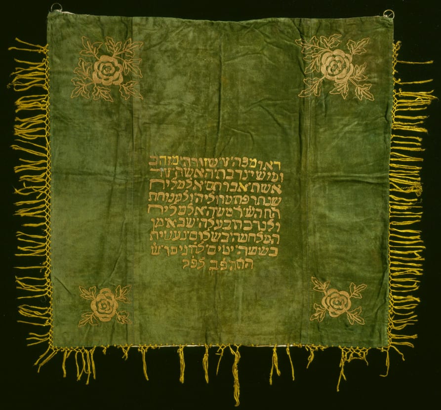 The dimensions of this cloth and the placement of its dedicatory inscription suggest that it was used as a cover for the Torah between lections. An embroidered flower fills each corner, and the lengthy inscription is in the center. It reads: