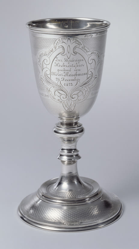 This kiddush cup was originally presented as a 50th wedding anniversary gift in 1875. The names and marriage dates of other family members are recorded up until 1977.