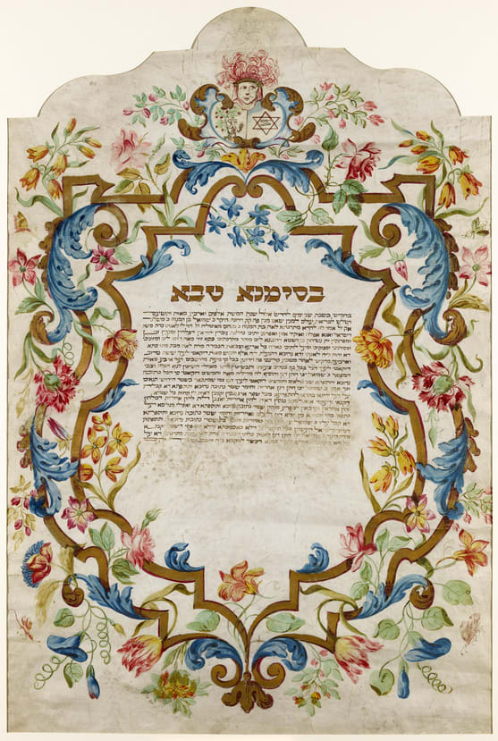 Italian ketubbot stem predominantly from the northern part of the country, with a few examples from central Italy, since Jews had been expelled from other regions before the form became popular. Written in parchment, they usually feature lavish ornamentation, inspired by both Jewish and Christian art. During the 18th century, decorations-ranging from biblical scenes to the signs of the zodiac-became so extravagant that rabbis enacted laws limiting expenditures on marriage contracts. This beautiful example comes from the city of Verona, where Jewish settlement may date to as early as the Roman period. Above the text, within a shield topped by a portrait of a man with a feathery headdress, are the coats-of-arms: at left, a squirrel perched against a fruit tree, symbol of the D'Italia family of printers to which the bride belonged; at right, the zodiac sign of Pisces within a Star of David for the groom. Affluent Italian Jewish families often adopted an unofficial coat of arms in imitation of local nobility. On the contract, the amount stipulated to be paid by the husband or his heirs in case of divorce or death is half the customary amount, since the bride was a widow.