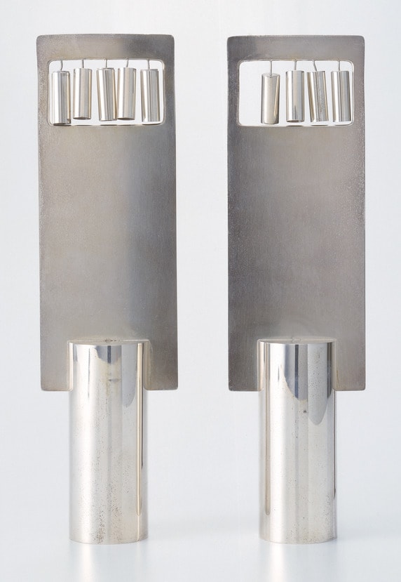 One of Zabari's most ambitious undertakings during the period resulted in the exquisitely wrought and conceived pair of Torah finials (rimmonim) of 1964. The basic function of Torah ornaments lies in the realm of hiddur mitzvah, as they beautify the synagogue and the experience of worship. Glorifying God by decorating the Torah, the handwritten parchment scroll in which the law is revealed and which is often lovingly known as "a Tree of life to those who hold fast to it": is a practice known to date from at least the Middle Ages. While traditional forms for finials have been either towers or pomegranates (rimmonim in Hebrew), Zabari's symbolic content emphasizes the Decalogue. The two Tablets of the Law are reduced to their essential form, but are monumental in their frontal positioning and geometric simplicity. The Ten Commandments are referred to by ten cylindrical bells, the use of which represents a conscious traditional choice. Bells adorned the robe of the high priest in biblical times, and hence have been historically used on all types of Torah ornaments. In this piece Zabari has accomplished the complex task of embodying traditional shape and content in an effective contemporary design.