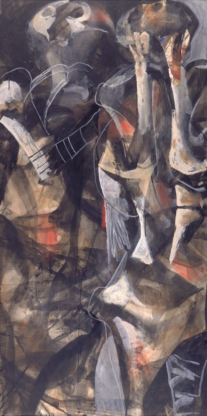Lebrun drew inspiration for his work from four photographs published in U.S. Camera Annual 1946. Along with many drawings, the paintings were made between 1955-1959, and titled after the camps or more generally as images of war, victims, and death. The artist's approach depended upon his powers of draughtsmanship and knowledge of the human figure. Lebrun was inspired by old and modern masters, among them the trecento Pisan painter, Francesco Traini and Pablo Picasso.