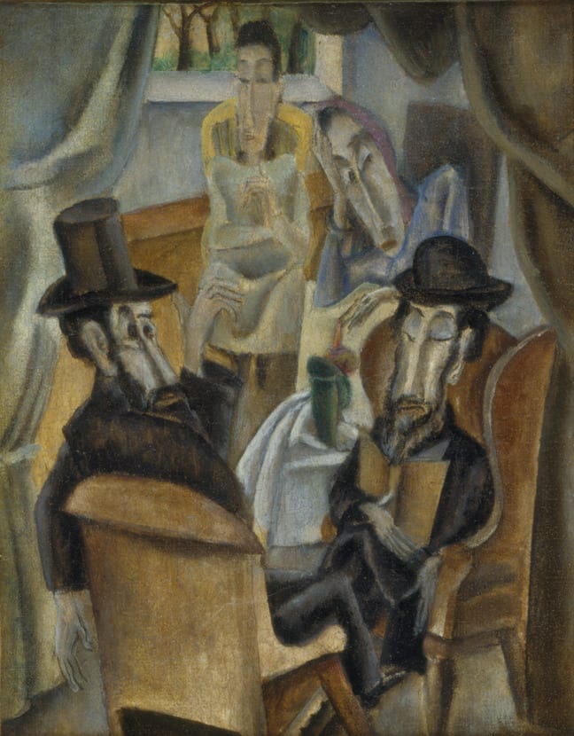 Weber began to explore spiritual and religious themes in his work around 1917. A few years later, he became actively involved with a group of Yiddish writers called Di Yunge, contributing woodcuts, essays, and poems to their journal. Sabbath is one of Weber's early religious paintings that link a modern Cubist vocabulary with a traditional Judaic theme. The simplified, angular forms create a dynamic setting for a scholarly Sabbath discussion. While the two men in the foreground with their figures, the women in the background would be as much at home in a bohemian salon as in a religious milieu. Weber's introduction of contemporary figures and an avant-garde style into a traditional religious theme offers a rarely seen modernist approach to Jewish imagery.