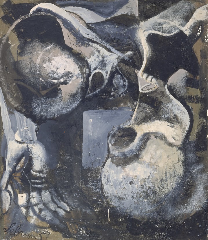 Lebrun drew inspiration for his work from four photographs published in U.S. Camera Annual 1946. Along with many drawings, the paintings were made between 1955-1959, and titled after the camps or more generally as images of war, victims, and death. The artist's approach depended upon his powers of draughtsmanship and knowledge of the human figure. Lebrun was inspired by old and modern masters, among them the trecento Pisan painter, Francesco Traini and Pablo Picasso.