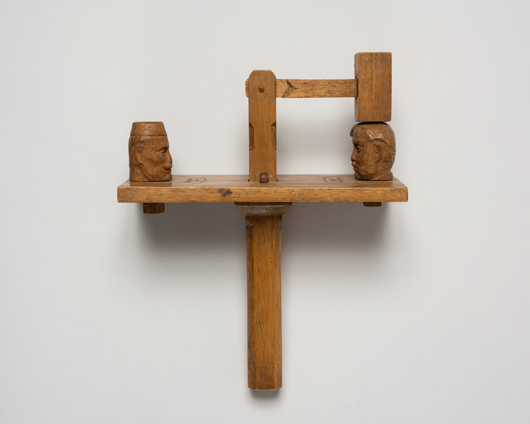 An early spring holiday, Purim commemorates the deliverance of Persian Jewry from the annihilation planned by the king's vizier, Haman, in the 5th century BCE. His plot was foiled by the Persian queen, Esther, who was Jewish, and by her uncle, Mordecai. The story, told in the biblical Book of Esther, is recorded in scroll form. On Purim, during the reading of the Scroll of Esther in the synagogue, it is customary to rattle noisemakers or groggers, whenever the hated villain, Haman, is mentioned. Jewish tradition often links past and contemporary oppressors of the Jewish people, as seen in this grogger that associates Adolf Hitler with Haman. The hammer makes a noise when it strikes the head of either figure.
