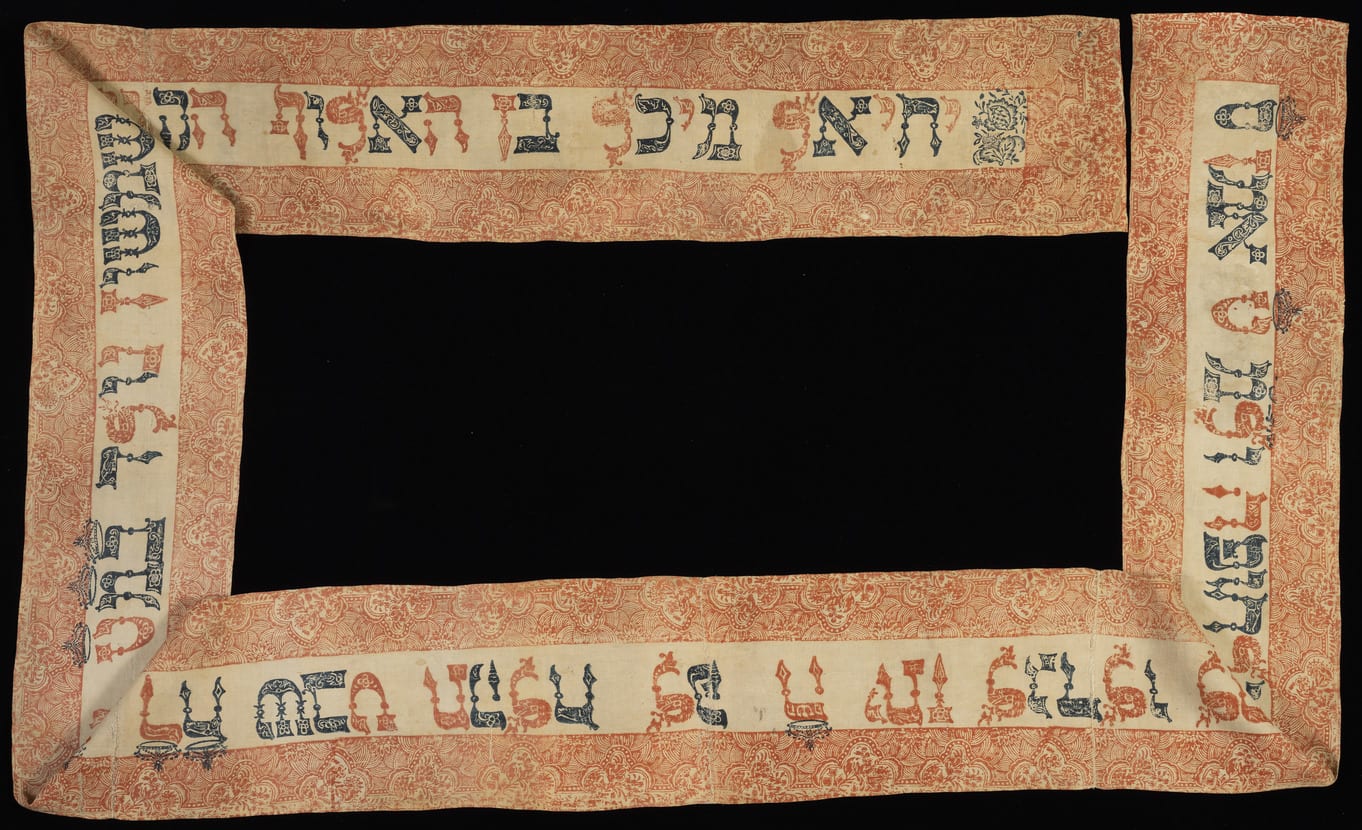A professional block printer stamped the motifs and lettering on the border and central panel of this binder. Block-printed textiles were popular in eighteenth-century Europe, where printers strove to improve methods to compete with imported Indian goods. Some Hebrew letters in the inscription have crowns above them, indicating abbreviations.