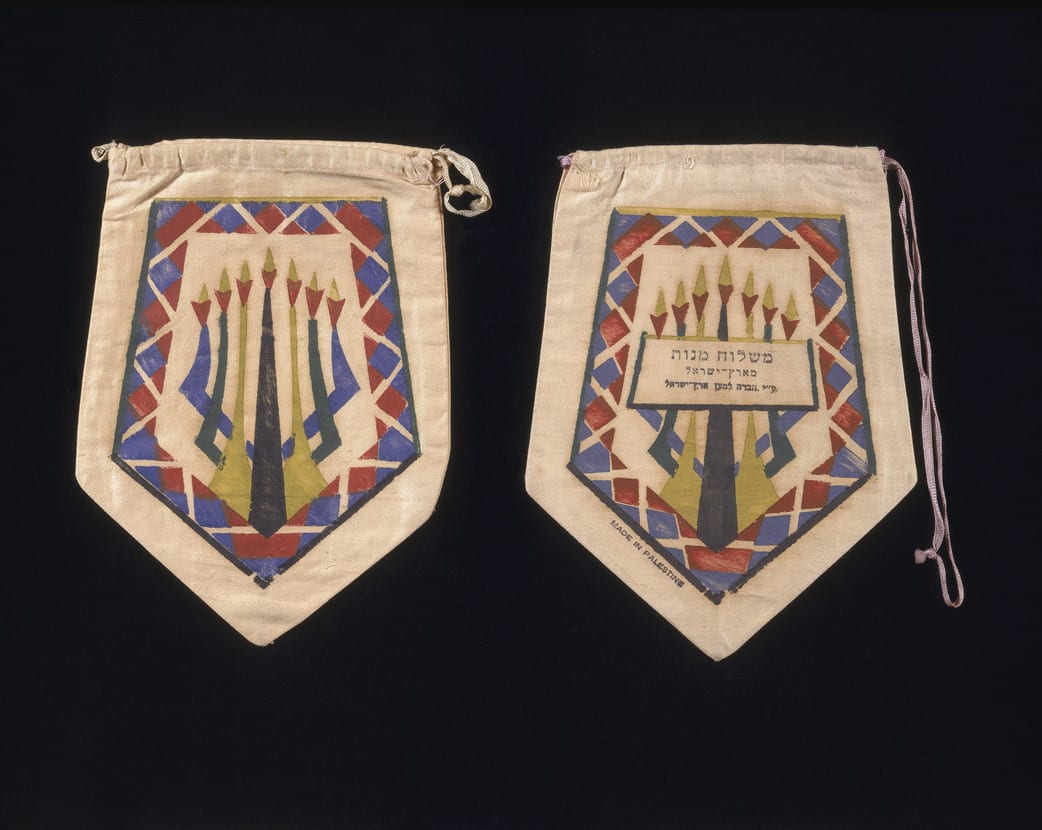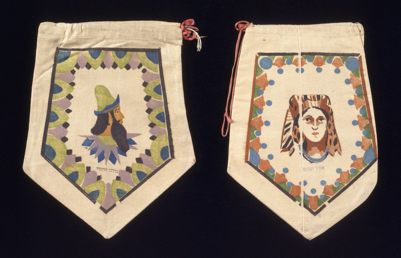 An early spring holiday, Purim commemorates the deliverance of Persian Jewry from the annihilation in the 5th century BCE. The story, told in the biblical Book of Esther, is recorded in scroll form and read on Purim in the synagogue. Purim is further celebrated by feasting, by exchanging foods with friends, and by giving alms to the poor. Featuring the heroes of the biblical story, Queen Esther and her uncle Mordecai, bags such as these would be filled with small gifts and sweets for the holiday.
