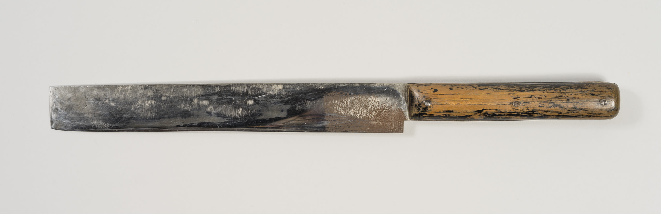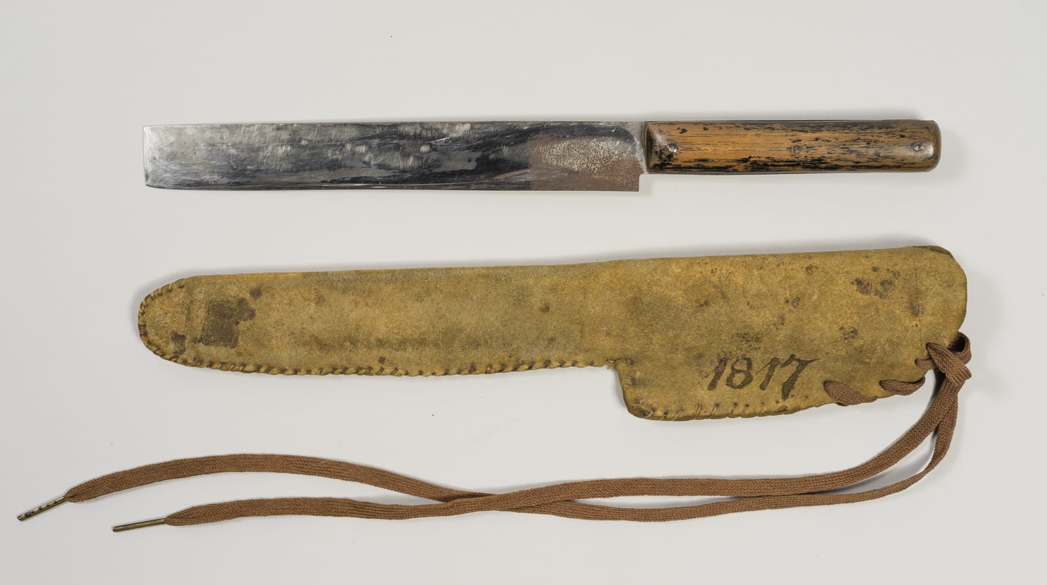 - knife: steel, painted wood case: sueded leather, ink, modern shoelace